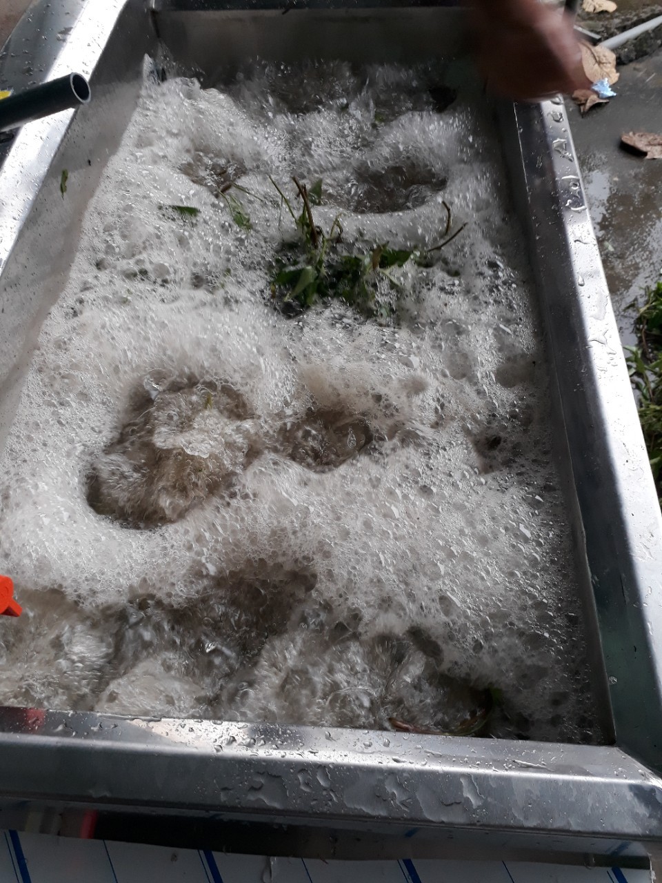 - Máy rửa rau công nghiệp 30kg dùng sục khí từ máy bơm khí được lắp cạnh bồn chứa nước rửa rau. Khí từ máy bơm khí chạy theo đường ống dẫn khí đi khắp các ngoc ngách của đường ống và khí thoát ra ngoài bằng những lỗ xả khí nhỏ, khí ra ngoài môi trường nước trở thành bong bóng to với áp lực lớn từ dưới lên trên và vỡ tung ra khi lên đến mặt nước và quá trình sẽ cứ lặp đi lặp lại như vậy đến khi rau củ quả loại bỏ được hết bụi bẩn và đất cát bám ở than, lá, vỏ.... rau sau khi được rửa sạch sẽ được sục lại bằng khí ozone để diệt khuẩn sạch sẽ. Như vậy là sẽ kết thúc quá trình rửa rau và nguyên lý hoạt động của máy.